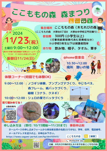 【ここももの森まつり】にお越しください ! 秋深まるここももの森で、大人から子どもまで楽しめる「ここももの森まつり」を 開催します ! 自然の恵みを感じながら、 心温まる一日を過ごしませんか ? ・日程 :11 月 22 日 ( 雨天の場合は 11 月 23...